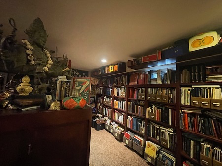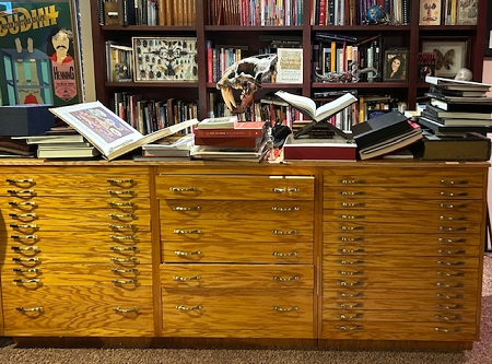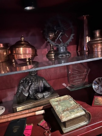 There is a secret to the Library that should not be missed. At its center rests a massive printer’s block filing cabinet that is, paradoxically, imposing yet easily overlooked. That piece houses the Ray Goulet Gimmick Collection, donated to the Mystery School after Ray’s passing. The drawers are packed with magical devices, gaffs and pocket tricks. Pull a handle and you might discover dozens of thumb tips, magic wands, production items or Japanese coin slides. Take time to compare a half dozen incarnations of the Vanishing Quarter, the Silk Wonder Box or the Zig Zag Playing Card. Considering different approaches to magical problems can offer insights into the creative process. Or you might discover, as I did, a box of “Custom Made Midget Starflowers featuring the All New Plastic Leaf” without figuring out exactly what they do…which is on my to-do list for my next visit!